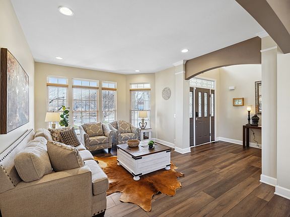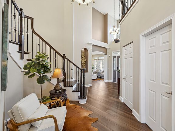 Nestled on a peaceful cul-de-sac, this elegant two-story home offers 4 bedrooms, office, 2 additional basement bedrooms, and 3.5 bathrooms. Designed for both comfort and style, this home features a grand staircase and an 18-foot high living room with floor-to-ceiling windows, filling the space with natural light. A gas fireplace adds warmth and charm to the space. The main floor includes a dedicated home office, a formal dining room, a separate family room, and a spacious kitchen with a breakfast area. A convenient half bath completes this level. Upstairs, you'll find four spacious bedrooms, including a massive master suite with a walk-in closet and a spa-like en-suite featuring a double vanity, soaking tub, and separate shower. The fully finished basement expands the living space with two additional bedrooms, a full bathroom, and an enormous recreational area. A wet bar makes this level perfect for entertaining. Outdoor living is just as impressive! It features a charming front covered porch and a huge backyard deck - perfect for relaxing or hosting gatherings. Located in a quiet and private cul-de-sac, this home also offers a 3-car garage and plenty of space for comfortable living. Don't miss out-schedule your private tour today!