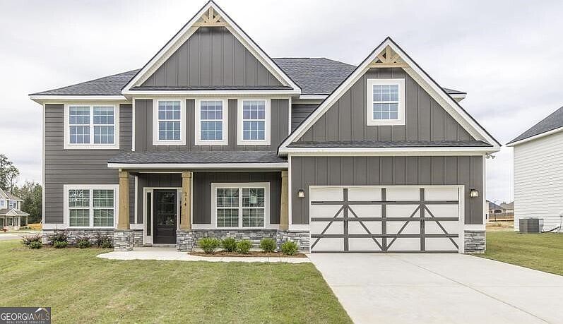 A Charming Hughston Homes Community nestled in the heart of Bonaire, Georgia, Magnolia Flats has everything you need to make it truly feel like home! Welcome to our 5-bedroom, 3 Bath Cypress B Floorplan. A Favorite plan with 3158 SF of Inviting Living Space. Our Hottest Floorplan! Inviting Entry Foyer, Formal Dining with Tons of Detail, Flex Space perfect for Home Office, Spacious Great Room w/ Woodburning Fireplace. The Gourmet Kitchen includes Ample Quality Cabinetry, Built-in Stainless Appliances with Gas Cooktop, Microwave/Oven Wall Combo, Stylish Vent Hood & Upgraded Dishwasher. Quartz Countertops & Herringbone Tiled Backsplash. The large Kitchen Island creates an ideal workspace, open to the Breakfast Area. 5th Bedroom & Full Bath on Main Level for Guests. Owner's Entry Boasts our Signature Drop Zone, the ideal Catch-all. Upstairs leads to the Media Room, a favorite for Movie Nights. Owner's Suite w/ Sitting Area & Trey Ceilings. Owner's Bath w/ Garden Tub, Tiled Shower, Vanity w/ Quartz Countertops & Walk-in Closet. Ample-Sized Additional Bedrooms w/ Great Natural Lighting. Upstairs Laundry & Hall Bath are centrally located to Bedrooms. Enjoy Luxury Vinyl Plank Flooring throughout most of the living spaces on the main level. Two Car Garage & Gameday Patio w/ Fireplace Perfect for Outdoor Living. Tons of Included Features such as Gas Tankless Water Heater, 2" Blinds on the Front of the Home, a Gourmet Kitchen, Gameday Patio & Quality Craftsman Style will set us apart. Elevate your lifestyle with Home Automation, Keyless Entry, Video Doorbell, Automated Front Porch Light and more!