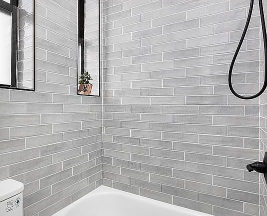 The open, windowed kitchen is outfitted with light-gray shaker cabinetry accented by fluted glass, a Summit stove, Classic by Unique refrigerator, American Standard fixtures and a breakfast bar. The windowed bathroom is designed with modern finishes, Delta tapware, and a deep soaking tub. The sleeping area is tucked away facing the building’s interior, creating a quiet retreat in the heart of downtown Manhattan.