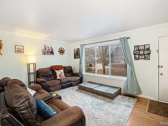 Charming, well-kept ranch on a quiet street with great curb appeal—brick facade, vinyl siding, vinyl windows, and a welcoming front porch. Inside, a sun-filled living room opens to a generous dine-in kitchen, and the adjacent dining area walks out through a slider to the patio and fenced backyard—ideal for grilling, pets, and play. Three comfortable bedrooms share an updated full bath. The lower level is a standout, offering a huge recreation/family room with built-ins plus separate utility and storage rooms—perfect for a media space, home office, gym, or hobby area. Thoughtful touches include crown molding, durable flooring, good natural light, and central A/C. Move-in ready and minutes to everyday conveniences, parks, and schools. (Information deemed reliable but not guaranteed—buyer to verify.