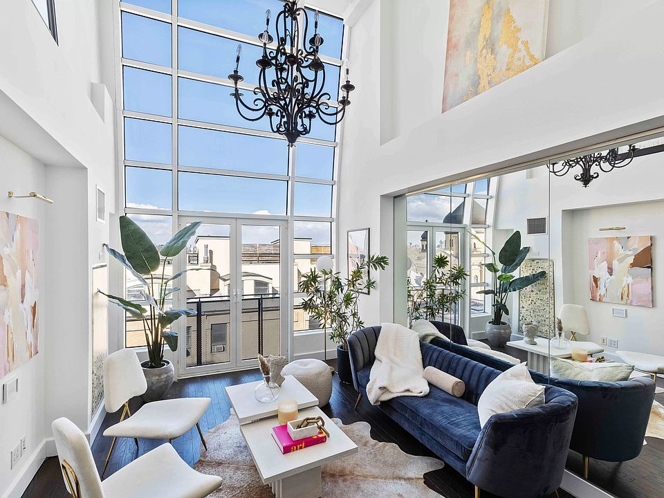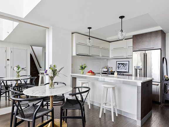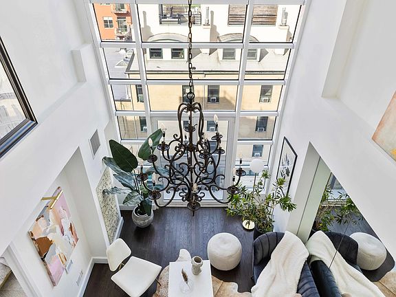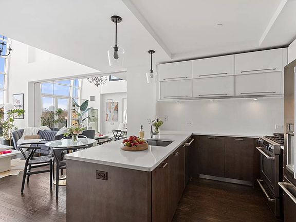 2 bedroom, 2 bathroom, Duplex Penthouse 6M, is a dramatic property with a terrace at one of Williamsburg's most sought after full-service buildings. This apartment features dramatic views over two floors of living space. A 17" foot ceiling is accented by a spectacular floor to ceiling window, which leads out to a Juliet balcony. The nearly 200 square foot terrace features, breathtaking views to McCarren Park, the river and city beyond. The north/east exposure in all of the rooms ensures that the apartment is sun-bathed all day. The state-of-the art of chef's kitchen features a newer Café refrigerator and dishwasher, Jenn-Air stove and quartz countertops. The elegant and generous living room can accommodate a dining table as well as a full living room. The bedroom on the first floor can accommodate a king-sized bed; it has a sizable closet as well as a generously sized bonus storage space. The first floor also offers a full bathroom, features modern tiles, a vanity and full-sized bathing tub. The Bosch washer/dryer and additional closets are also found on the first floor. On the second level, one will find the entrance to the immaculately landscaped expansive private terrace with breathtaking views of McCarren Park, the promenade and beyond. Relaxing at the end of a long day is no longer in question. The second floor also contains the primary bedroom with a bonus space for an extra room, or a large closet. The second full- bathroom is lined with natural lava stone in a sophisticated palate. Warehouse 11 is a cornerstone of Williamsburg; a 24 hour doorman building, with a fully equipped gym, bike storage, a roof deck featuring impeccable landscaping, several charming pagodas, Adirondack Chairs and delightful city views. The children's playroom is slated to open soon with a brand new redesign. It is located in the most desirable part of Williamsburg, just a stone throw from McCarren park, Lillia, The Bathhouse, All's Well and Butler. The Williamsburg and Wythe Hotel are just a few short blocks away. A few blocks further, one can enjoy, Rule of Thirds, The William Vale, and plenty of trendy shopping. Whole Foods and Trader Joe's are walkable as well. The building enjoys a tax abatement until 2025. Parking spots are available for rent in the building.