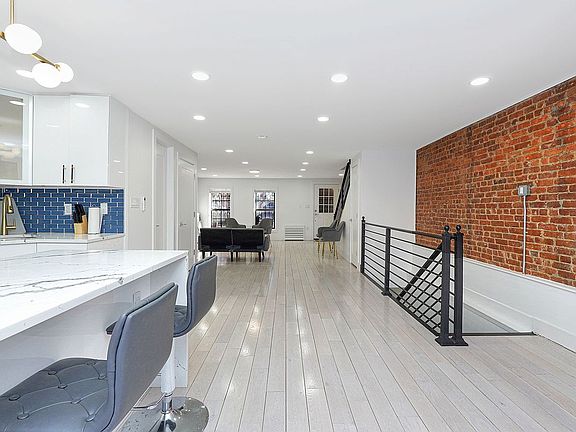 On the parlor level, the master bedroom with an ensuite bath can easily accommodate a king size bed and has a custom-built walk-in closet. There are two additional bedrooms and a full bath, with one of them featuring exposed brick walls, which add character to the space. The third floor offers two more bedrooms, a full bathroom, and a quartz kitchen island top with elegant cabinetry, giving you another space to cook or entertain guests.