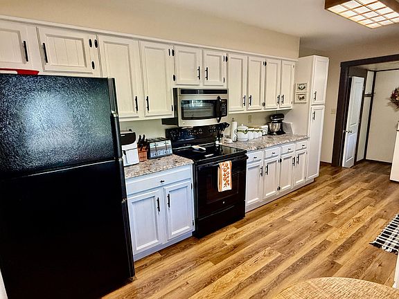 Tucked away on the edge of town, this charming 3-bedroom, 1.5-bath home offers the perfect blend of privacy and convenience. Step inside to a spacious main floor featuring vaulted beam ceilings in the living room and a large picture window that fills the space with natural light and offers a peaceful view of the yard. The kitchen is generously sized with room to gather, and the main floor laundry adds everyday convenience. The primary bath has been beautifully updated with a no-step shower. Primary bedroom and half bath on the main level. A two-car attached garage opens into a large entryway, and the full basement provides a rec-room, workshop, and plenty of storage space and a second laundry. Large fenced yard with play set, patio area, and garden shed. Located on a quiet dead-end street yet close to city amenities, Hwy 51, and schools.