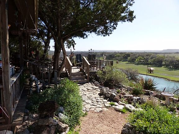 This warm and beautiful rock home sits on a high bluff overlooking 300 ft of the beautiful Llano River. The setting is perfect for family living and gatherings that include enjoyments such as kayaking, fishing, hunting, bird watching, and nature walks. During winter months, the rock fireplace in the great room, the wood stove in the master bedroom sitting area, and the chimenea on the deck provide cozy places to relax, stay warm, and enjoy companionship. The main house includes 3 bedrooms and 2 full baths. The master bedroom is privately located on one side of the house along with a TV room and sitting area , while the 2 guest rooms are located on the opposite side of the house and share a Jack and Jill bathroom. The vaulted ceiling in the great room features a floor to high ceiling rock fireplace, built-in custom cabinets and book shelves that house high definition surround sound TV, DVD, and CD equipment. The kitchen is complete with all electric appliances and has a bar and open view of the great room and dining area. Lots of windows let the outside in. The great room opens onto the front porch on the northwest side and opens to the back porch and deck to the southeast overlooking the river. There is a large office located adjacent to the master bedroom with custom built in desks, cabinets, and book shelves. The garage is detached from the main house with a closed in store room attached to the back. The second story of the garage houses a guest quarters area with accommodations to sleep 6, complete with a bathroom and shower. In addition, there is a separate art studio with lots of light and work areas for creating and discovering new hobbies. The property is completely fenced with a barn and two deer blinds and feeders. Most furnishings will convey with the sale of the home and property.