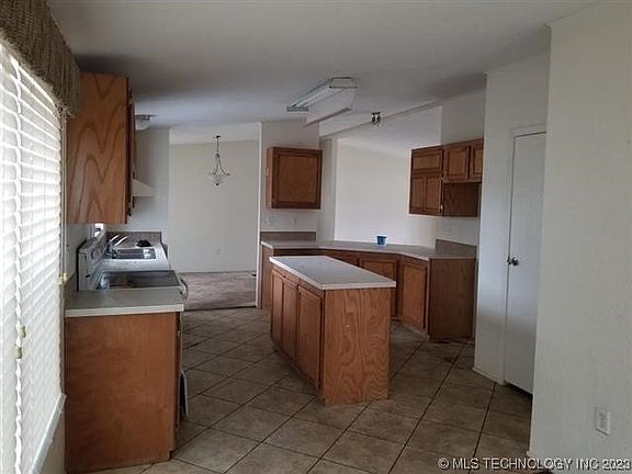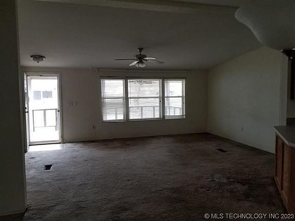 This Solitaire doublewide mobile home offers 2 dining areas, bar and island in kitchen, split floor plan, primary bed has walk in closet, private bath with double sinks and separate shower, inside utility, covered front deck, metal roof, 2 car detached carport with concrete slab, 2 sheds in backyard, small deck on left and chain link fencing.