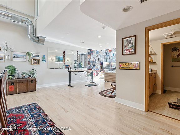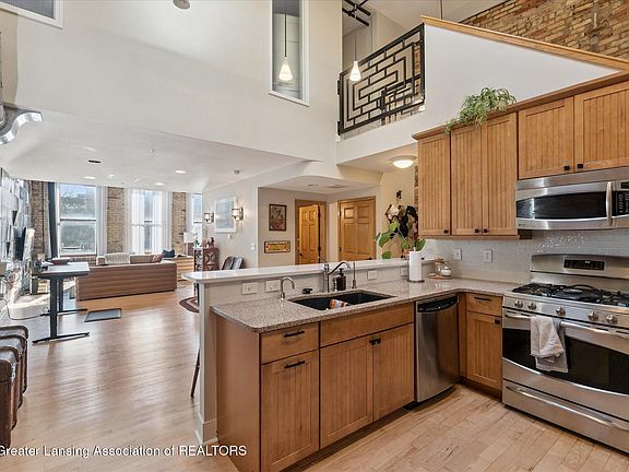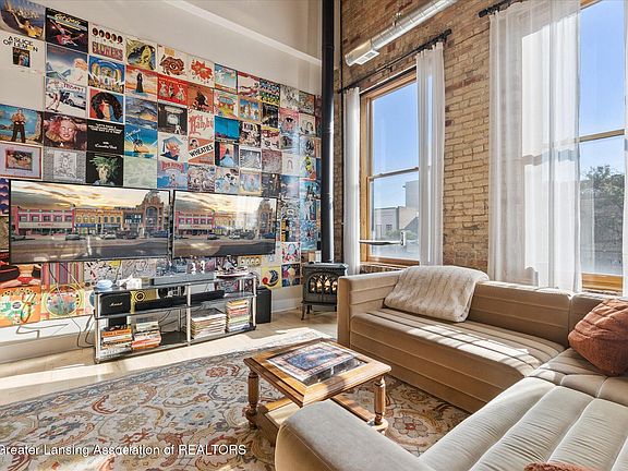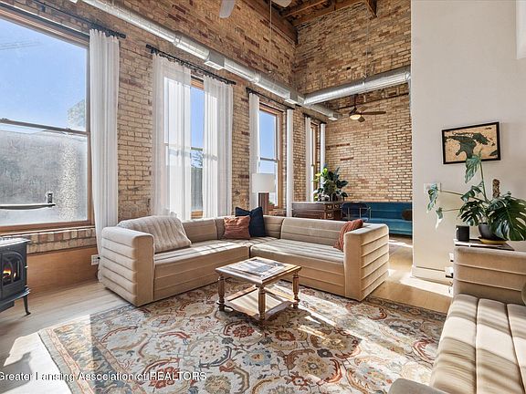 Located in the heart of downtown Lansing, this one-of-a-kind condo is as stylish as it is functional. Offering 1 bedroom, 2 full baths, and a rare private garage, this loft-style space blends character with convenience. Step inside to soaring ceilings, exposed brick walls, hardwood floors, and oversized windows that flood the home with natural light. The open-concept kitchen and living area feature a cozy gas fireplace and views of the city, creating the perfect space to entertain or relax. Upstairs, the master suite feels like it's floating above the living room, connected by a striking ''bridge'' walkway. The suite includes a spacious bedroom with skylight, full bath, and a unique overlook with shutters for privacy. With in-unit laundry, modern amenities, and unmatched style, this condo is just steps from Lansing's best restaurants, the State Capitol, and all the energy of downtown living.