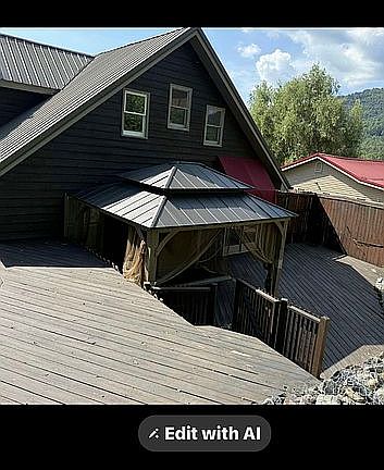 Large back deckStorage buildingCedar sidingMetal roofSmall officeFront porchTwo possibly three bedrooms
