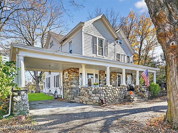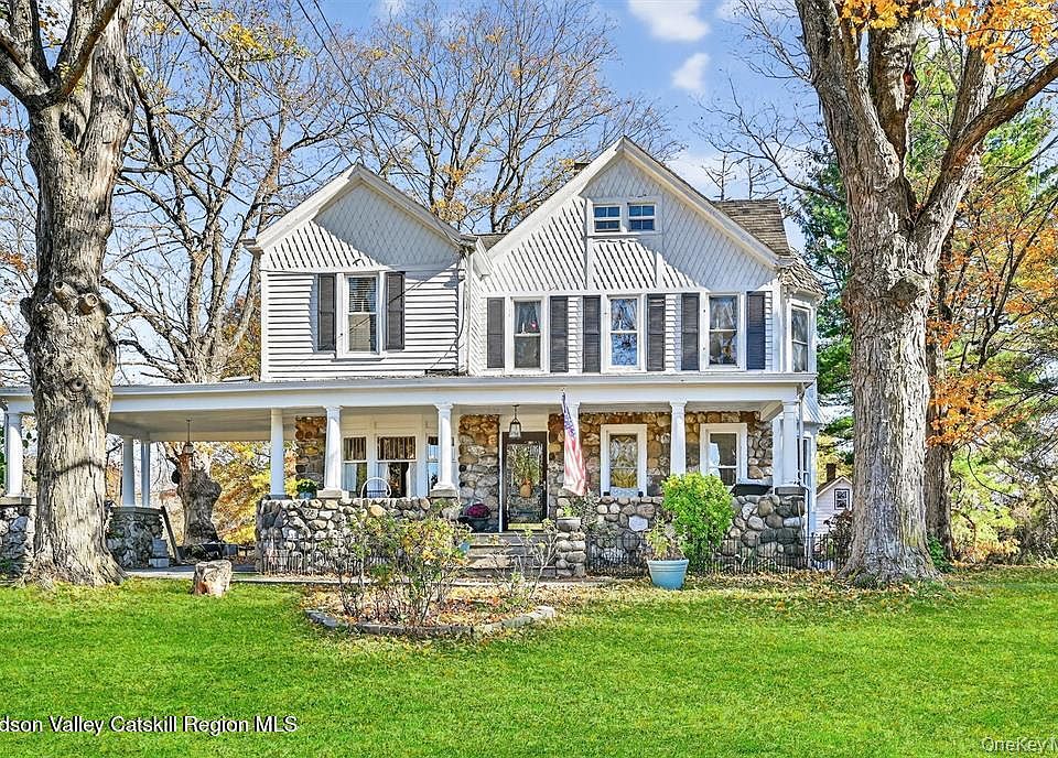 This 1800s Colonial stone home sits on 1.9 magical acres with blooming perennial gardens, mature trees, and a private walking trail with views of the Shawangunk Mountains. Rich with character and history, this home invites you to reimagine what's possible, whether you're seeking a full-time residence or a weekend retreat. A gated circular driveway leads to the stately facade and classic rocking chair front porch, the perfect place to relax or entertain. Inside, the sunlit foyer showcases original wood details and moldings that open to a front sitting room with a bay window and oversized pocket doors leading to a cozy library with a wood-burning stone fireplace. The main level continues into a spacious living room and a formal dining area filled with natural light. The kitchen, just off the dining room, offers an eat-in nook, laundry hookups, and access to a mudroom with a half bath. Upstairs, you'll find three spacious bedrooms, a den or office that could serve as a fourth bedroom, and a full bath featuring a clawfoot tub and timeless black and white tile. A walk-up attic provides ample storage or future conversion potential, while the unfinished basement offers workspace or additional storage with exterior access. Outside, the possibilities continue. The property includes an outbuilding that was once a gym, ready to be transformed into a studio, guest cottage, or creative space. With thoughtful updates and imagination, this property could become an extraordinary upstate haven. Just minutes from the heart of the Village of New Paltz, you'll find an abundance of local charm with vibrant restaurants, farm markets, boutiques, breweries, and art galleries. Surrounded by the natural beauty of the Hudson Valley and only 90 minutes from New York City, this home offers the perfect balance of escape and connection.