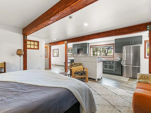 Step into this bright and inviting open-plan studio, featuring exposed beams, recessed lighting, and large southeast-facing windows that fill the space with natural light. Tucked away on a peaceful, sought-after street, it's just a five-minute walk to downtown Ojai and close to top local spots like The Dutchess, Bart's Books, Libby Bowl, the Bike Trail, and a nearby grocery store. Enjoy a private entrance and two shaded patios beneath beautiful oak trees. The modern kitchen offers quartz countertops, a tiled backsplash, and stainless steel appliances. The bathroom is updated with a glass-enclosed marble-tiled shower. Additional features include in-unit washer and dryer, generous storage, and a fully fenced yard for added privacy. Studio is located down stairs. One-year lease preferred. Pets considered with an additional deposit. Utilities will be split with upper unit on property.