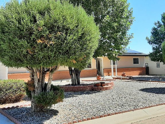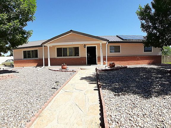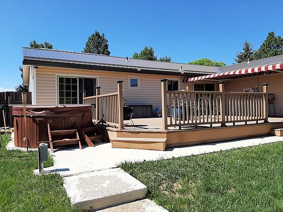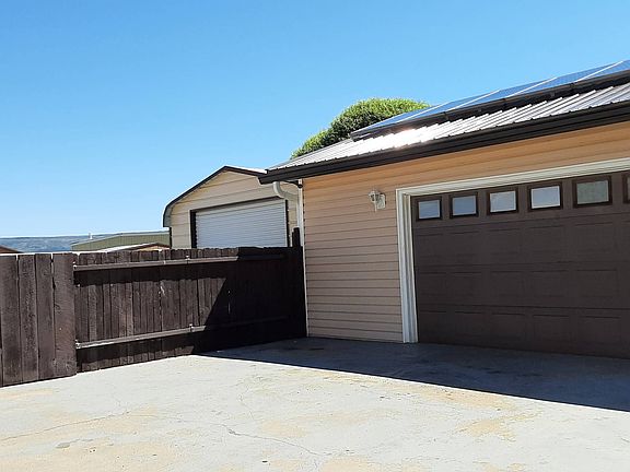 This home has it all, 4 bedrooms, 3 baths, kitchen and dining have open floor plan. Gas fireplace in family area, laminate flooring in open kitchen area, master bedroom, plus bathrooms, carpet in bedrooms and family room. The large deck encompasses a canopy, hot tub, composite decking and railing. Detached two car garage, detached one car garage, storage sheds, concrete driveways, zeriscaping in front yard, mature trees and shrubs, plus grass and landscaping rocks throughout the yard. Recently installed a more efficient HVAC system with air conditioning. Solar panels provide electric power to the house, garage and sheds. Owner is currently finishing master bath shower area.