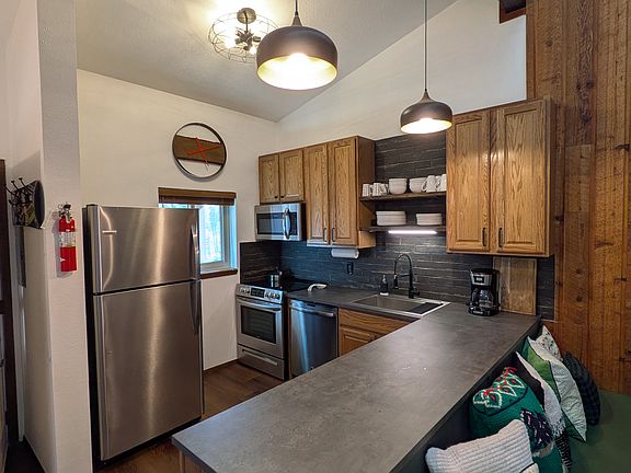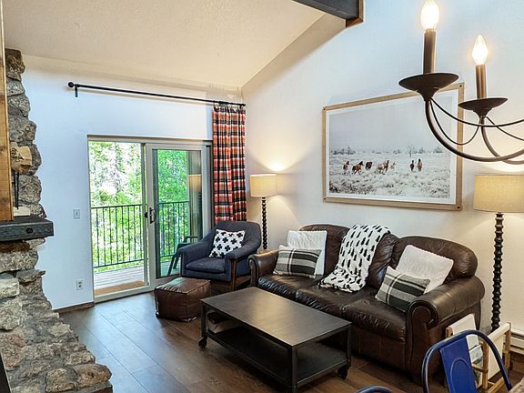 Fully furnished, newly remodeled and professionally decorated with newer stainless steel appliances, mattresses, and flat screen tvs. This top-floor end unit has vaulted ceilings and clerestory windows in the living room that highlight the gas fireplace, with a 50" flat screen tv with HD cable and access to a balcony overlooking the forest. The front porch offers excellent views of the Continental Divide & the Resort. Fully equipped kitchen. Elegant primary bedroom in high-end mountain style has a newer queen bed and its own bathroom. The bunk room has vaulted ceilings and a twin over full bunk bed, plus a twin trundle--doubles as an a second family room with a 48" flat screen tv and its own bathroom.