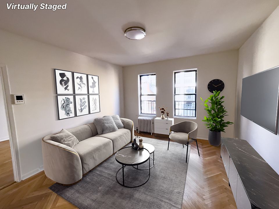 Renovated corner 1BR in an elevator building at express subway stop. Unit faces west and has great natural light, hardwood floors and high ceilings with a full open kitchen with microwave and dishwasher. Super lives on site. Must see!