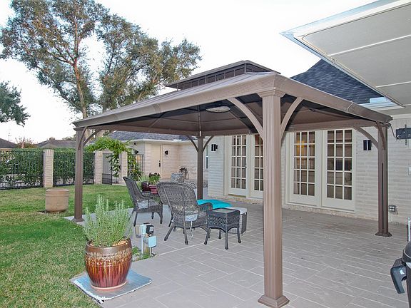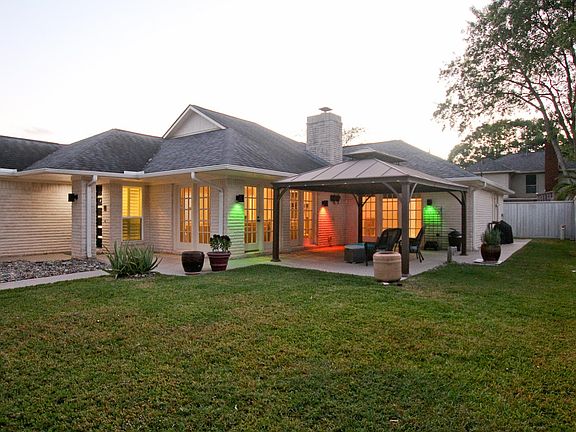 One Story 2100+ sqft updated Sugar Creek. Water Feature welcomes guests to this wonderfully appointed home. Recent roof, plumbing lines, Front door, windows and more! Roomy Kitchen with Gas Range, Breakfast Bar, Granite, White Cabinets and Breakfast room. Storage cabinets and closets galore! Formal Dining w/tray ceiling, Wine room wet bar Open to the Famly room with Recessed lighting, Vaulted ceiling, Gas Fireplace with shattered Glass rock base. Wood and Tile flooring throughout. Primary Bed vaulted ceiling with access and triple French doors lighting the room, adding access to the covered outdoor patio area. Window coverings include Plantation Shutters, Wood blinds and sheer draperies. Primary bath double sinks, open his and hers shower with individual rainsoft heads. Outdoor covered metal patio cabanna style on the stamped concrete pad. Mosquito system keeps bugs away, recent insulated garage door! Fenced yard in front provides private front yard. Come see it today!