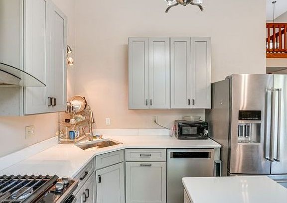 One-car attached garageVaulted ceilingsHardwood floorsLarge drivewayModern kitchen