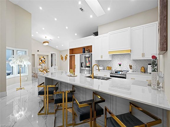 Exquisite Fully Remodeled Hawksridge Pool Home! Beautifully updated 3-bedroom plus den, 2-bath residence offering 2,229 square feet of living space in highly sought-after Hawksridge. French door entry opens to an airy layout with vaulted ceilings and modern porcelain tile flooring throughout. Spacious living and dining areas flow seamlessly to the screened lanai and pool, creating an easy transition between indoor and outdoor living. A gourmet kitchen features quartz countertops, stainless steel appliances, wine cellar, subway tile backsplash, abundant cabinetry, and a large peninsula with seating. The primary suite offers private access to the lanai, a generous walk-in closet, and a remodeled bathroom with dual sinks, a walk-in shower and a soaking tub. Outdoor living space includes an expansive screened lanai, sparkling pool, outdoor shower, and multiple seating areas for dining or relaxation. Situated on an oversized .59-acre lot with mature landscaping, the property offers exceptional privacy and curb appeal. Hawksridge is an established gated community known for low quarterly HOA fees, a clubhouse, fitness center, and tennis courts. Located just minutes from Naples beaches, shopping, fine dining, and entertainment, this home delivers both convenience and comfort. Move-in ready and fully remodeled, this property combines quality finishes, an open layout, and a premium central Naples location within a well-maintained community, perfect for buyers seeking a modern home with space, style, and privacy in a prime setting.
