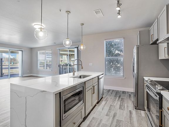 E2 homes feature an open layout, stainless steel appliances, a single-compartment sink, and a full-size washer and dryer.