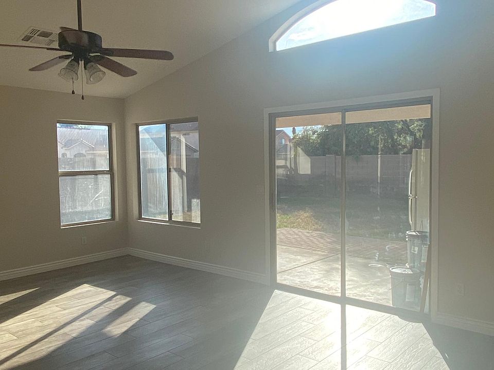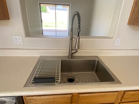 Modern upgrades include custom paint inside and out with upgraded tall baseboards, upgraded kitchen sink with new faucet, Wood look porcelain wide plank floors throughout, bright and airy with vaulted ceilings, ceiling fans, and tons of natural light, new ceiling fans with LED in secondary bedrooms. New two inch cordless blinds on all windows. Upgraded bathrooms with glass tile backsplash and new modern faucets. LED ceiling lights in kitchen and hallway, new kitchen light fixture. Stainless steel upgraded appliances, refrigerator available if needed, vaulted ceiling, center kitchen island, and windows with lots of cabinets with pantry and open to the great room. Home is on a corner lot with private grassy backyard that's undergoing an overhaul with new curbing, landscaping and new sprinklers with a north facing covered patio.
