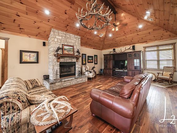 At the heart of the home, is the vaulted cathedral ceiling living area. The giant elk antler chandelier is only outdone by the custom hand built limestone fireplace complete with granite hearth. Offering the option to burn gas or wood, the fireplace offers the ambiance that ties the home together, while also offering a good source of heat complete with blower.