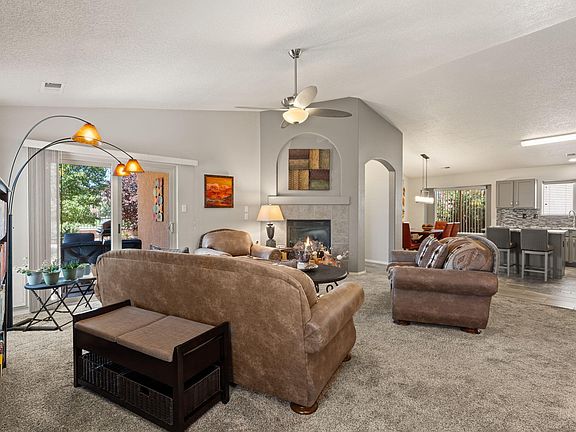 Beautiful Move in Ready home. Pride of Ownership. Walk into living room w/inviting fireplace for cold winter nights. Also an office/sitting rm. Primary Bedroom separated from other bedrooms. Newer carpeting, Updated Kitchen w/Granite Counter tops & Stainless Steel Appliances. Extended back Patio, backyard overlooks Park Above. Finished Garage. All appliances convey including stools at kitchen island, washer and dryer, out door grill & moveable fire pit. Refrigerated Air, Reverse Osmosis, Water Softener, Circulating Pump on Water heater for instant heat. Owned Solar. Close to shopping, entertainment and restaurants.