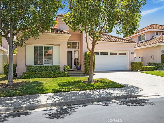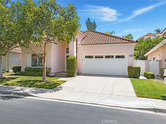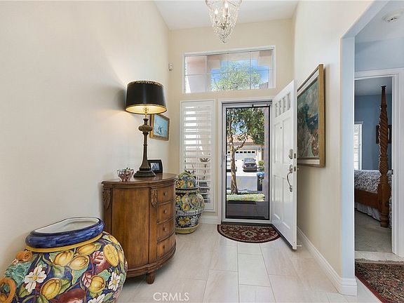 Welcome to this lovely single level house located in the highly desirable and prestigious 55+ gated community of Palmia. Vaulted ceilings, sky lights and thoughtfully placed windows illuminate the home with natural light. Beautifully presented with many upgrades, including a fully remodeled kitchen and primary bathroom. Newer carpeting and padding in the living room, dining area and bedrooms, and porcelain floor tiles throughout the remainder of the house. Family room and kitchen area features remote-controlled upgraded silk shade window treatments, adding a feel of elegance. Open and spacious living room and dining area have wide plank wood shutters and separate the primary suite, secondary bedroom, and full bathroom for added privacy. Beautifully appointed kitchen with relaxing earth tone cabinets, Quartz countertop and breakfast bar, subway tile backsplash, a farmhouse sink, LG and GE stainless steel appliances, double oven, 5-burner gas stove, pantry with convenient pull-out drawers, trash cabinet, and is open to a spacious breakfast nook and family room, highlighted by an elegant fireplace with toggle switch gas starter, and a ceiling fan. Private rear yard with a covered patio, landscaped in a tropical setting; it’s the perfect place to unwind or entertain and is piped for natural gas outside if an outside kitchen/BBQ desired, with easy access into kitchen, dining area and family room. Find your sanctuary in the primary bedroom with large windows, vaulted ceiling and fan, as well as a private slider to the back patio. The exquisite highly upgraded and remodeled ensuite bathroom offers a granite dual sink vanity, oversized glass enclosed walk-in shower with waterfall shower head and a seat, featuring imported Mosaic Matte Italian tile, newer TOTO commode with bidet, and a large walk-in closet. Other highlights include an individual laundry room with cabinets and a countertop, Wynstan security screens at front and garage side door, newly cleaned and sealed grout on porcelain tile flooring, newer water heater, whole house Pex plumbing re-pipe (1 year ago), garage with built-in cedar lined cabinets and epoxy flooring, and keypad on garage and front door. Enjoy the close proximity to the clubhouse and enjoy all the amenities it has to offer including a18-hole putting green, resort-style swimming pool and spa area, tennis, pickleball, shuffleboard and bocce ball courts, fitness center, library, billiards room and more. Your dream retirement awaits!