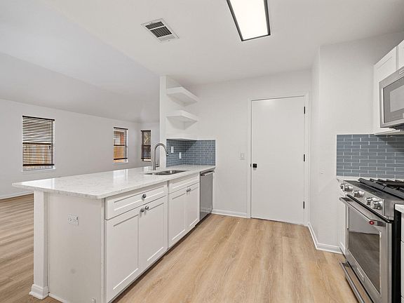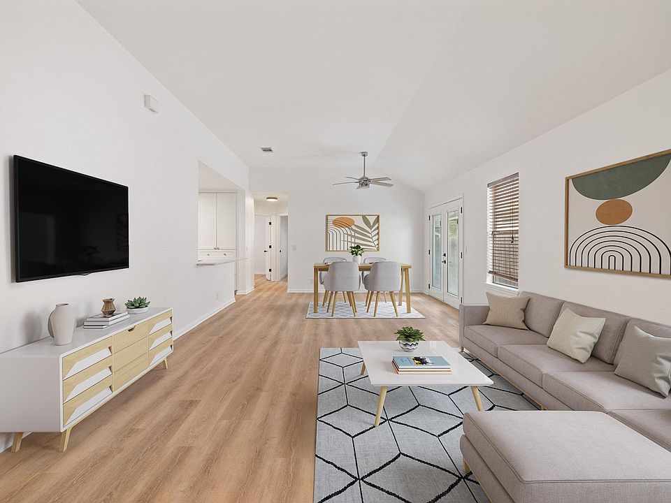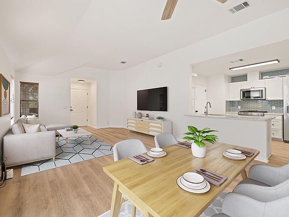 Beautiful home in The Ridge at Steeds Crossing. Conveniently located in Pflugerville, this recently renovated 2-bedroom, 1-bath home offers 1,317 sq. ft. of modern comfort—just minutes from H-E-B, Costco and a variety of shopping and dining options. Enjoy peace of mind with a new roof and HVAC system, adding value and efficiency. The bright, open living space features soaring ceilings, luxury vinyl plank flooring, and wood blinds throughout—no carpet anywhere. The updated kitchen is both stylish and functional, boasting quartz countertops, classic subway tile backsplash, stainless steel appliances—including a five-burner stove—and decorative cabinet hardware. Both bedrooms feature updated ceiling fans and lighting, while the spa-inspired bathroom offers dual sinks, light-integrated mirrors, and a beautifully tiled shower/bath with both waterfall and handheld options. Step outside to your private, fenced yard with a deck—perfect for relaxing or entertaining. The garage conversion can be used as a third bedroom, second living or office/studio. This move-in-ready home combines thoughtful updates with a prime location—schedule your showing today!