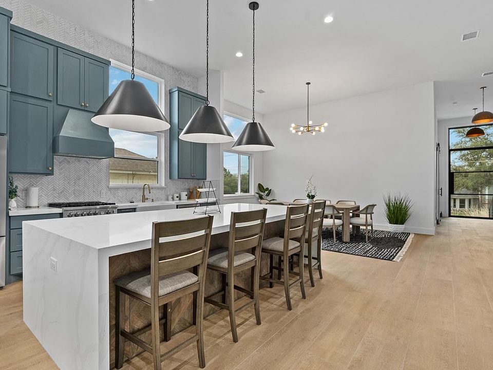 Cozy stone fireplaceOpen floor planUnique chandelierHigh ceilingsAbundant natural lightBuilt in buffetWide open entryway