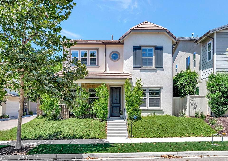 End lot Seabreeze neighborhood home in Harmony Grove Village has 4 bedrooms, 3.5 bathrooms and features multiple built-ins, picture frame wainscoting, accent walls, and upgraded flooring throughout. The flexible floor plan includes a first-level bedroom with an attached private bathroom, a dedicated office with a walk-in closet, an upstairs loft, and thoughtful storage nooks. Additional highlights include owned solar, plantation shutters, a chef’s kitchen with granite countertops & stainless appliances, built-in media center, tankless water heater, a low-maintenance backyard with pavers, and a spacious primary suite. The kitchen is a true standout, featuring updated flooring, white cabinetry with two upper cabinets showcasing glass-front doors, granite countertops, and a large center island with seating. Additional upgrades include a full custom tile backsplash, under cabinet lights, stainless steel appliances, pendant lighting, and pull-out trash receptacles. The kitchen opens to a bright dining area accented with wainscoting and windows that bring in abundant natural light. Sliding glass doors lead directly to the backyard, creating a seamless indoor-outdoor connection. Throughout the main level, you’ll find elegant picture frame wainscoting, updated flooring, and custom millwork. A stylish hallway nook with a built-in ledge and arched mirror provides visual interest and display space. The powder room is conveniently located and finished with modern upgrades. The family room includes a built-in entertainment system with shelving and lower cabinet storage, a ceiling fan, and plenty of space for comfortable seating. The adjacent paved backyard is low maintenance and ideal for outdoor entertaining or relaxing, with multiple areas for seating and easy access from the main living area. The versatile first-level office offers a picture frame wainscoting accent wall, plantation shutters, updated flooring, and a walk-in closet. The first-level bedroom features a custom wood-paneled wall, plantation shutters, a closet with wood sliding doors, and an attached private bathroom with custom tile backsplash, updated fixtures, and a floor-to-ceiling tile shower with frosted glass doors. Upstairs, the spacious loft offers flexibility for a second living area, office, or media room and includes recessed lighting, a ceiling fan, and a charming round window in a custom-cut nook. Additional upstairs bedrooms include ceiling fans, plantation shutters, and closets with sliding wood doors. A built-in storage nook with storage cabinets adds function to the upper hallway. The upstairs bathroom features white countertops, a custom tile backsplash, an extra-large mirror, and a shower/tub combo. The upstairs laundry room is fully equipped with upper and lower cabinetry and multiple hanging racks for added convenience. The primary suite features a ceiling fan, plantation shutters, a built-in shelving nook with lower storage, and accent wall. The en-suite bathroom includes dual sinks, tile backsplash, a wall-to-wall mirror, a soaking tub, a walk-in tile shower with bench seating and glass doors, a private toilet room, and a spacious walk-in closet with recessed lighting. Harmony Grove Village is a master planned community with gorgeous mountain ridgeline views, multipurpose trails, gated pool for homeowners, multiple private parks and huge 4th of July Park (open to the public). The Grove is the perfect place to enjoy the outdoors- it includes the pool, jacuzzi, wading pool, barbeques, shaded tables, play structure and a covered lounge area with outdoor furniture and fireplace.