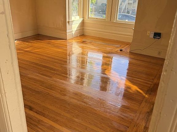This apartment boasts a spacious layout with an abundance of natural light that beautifully illuminates the hardwood flooring throughout.