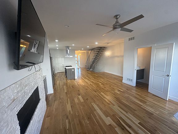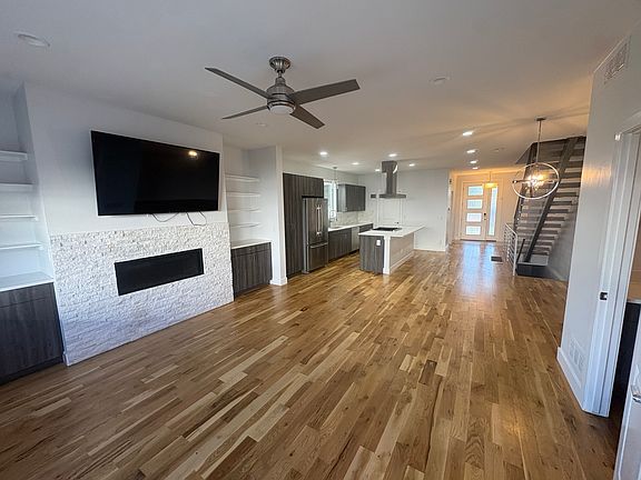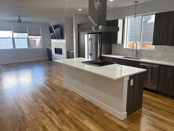 Open-concept kitchen with quartz countertops, stainless steel appliances & large island. Spacious living & dining areas with hardwood flooring.