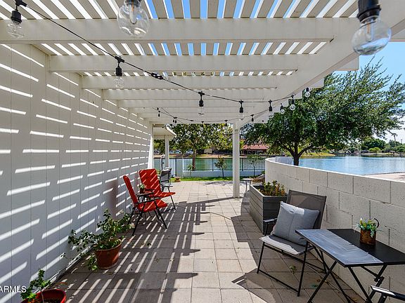 LAKE FRONT in Dobson Ranch! Unobstructed views, walking & bike path just steps out the gate. Newer paver patio with pergola overhead for shade and with lighting. Gorgeous kitchen with stainless appliances, granite counters. Updated bathrooms and beautiful wood plank looking tile floors. This home has been well cared for and comes with the newer refrigerator and washer / dryer. Lots of special features including a new 4 panel glass door to the back yard, new A/C unit in 2019, and LOW LOW LOW electric bills approx $130 month. Exterior painted in 2021. Large lot with grass and mature landscaping & trees. Interested in how you can get a low interest rate, please see flyer in documents tab.