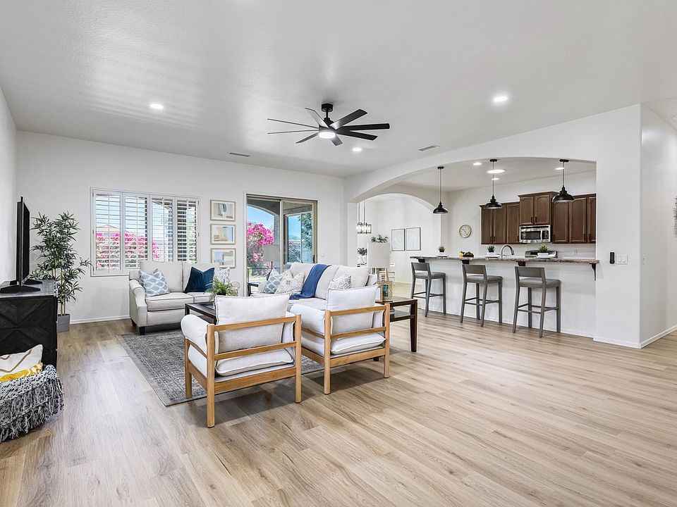 Fantastic, clean home that's move in ready! 3 bedrooms + an open den! Located in the heart of Queen Creek, AZ in the community of Nauvoo Station, the beautifully manicured landscaping gives this house great curb appeal. The entire home has fresh interior paint, new luxury vinyl flooring & newer carpet. It has the perfect open floor plan & even includes an open den space that could be used as a home office, playroom or to display your grand piano. The kitchen is gorgeous & has updated cabinetry, granite countertops, a gas stovetop oven & stainless steel appliances. The spacious owner's suite features dual vanities, a separate shower & tub & a walk in closet. Located on the other side of the house are 2 more bedrooms giving the property the split floor plan many people are looking for. Out in the backyard you'll discover the covered patio, a beautiful grass area & gorgeous landscaping. And NO neighbors behind you! Don't miss out on this amazing house! Owner/Agent