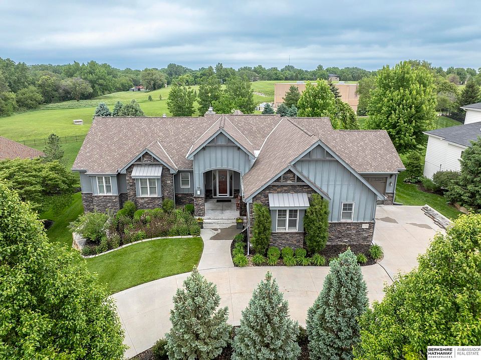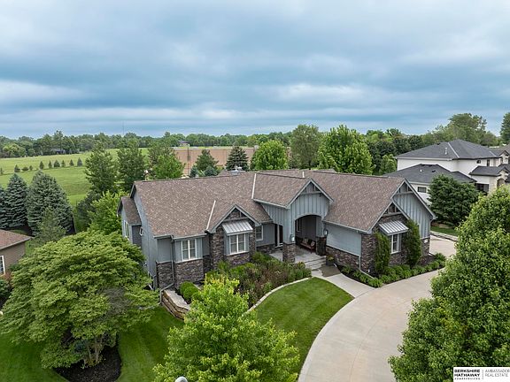 Contemporary chalet-style home in Elkhorn schools! Setting on a .57-acre cul-de-sac lot, this sprawling ranch offers privacy & tranquility. Great room features soaring ceilings with wood beams and a spectacular stone fireplace. Chef's kitchen boasts two large islands, custom cabinets, granite, 2 dishwashers, built-in fridge, warming drawer, appl garage, etc. Dining area accommodates large gatherings, walk-in pantry offers ample storage. Enjoy outdoor living with screened-in deck & covered deck overlooking extensively landscaped yard with no rear neighbors. Primary suite includes office and upscale bath with heated floors, walk in shower, 2 sinks, wp tub, and a walk-in closet with attached laundry. Lower level features a 2nd FP, 3bedrooms, a 2nd kitchen/bar, a hidden room, & covered patio with firepit. Additional amenities include circular drive, sideload garage, 2 hvacs, sump pumps and a roof with lightning protection. This home exemplifies quality craftsmanship & thoughtful design.