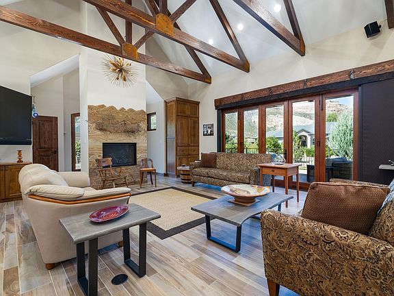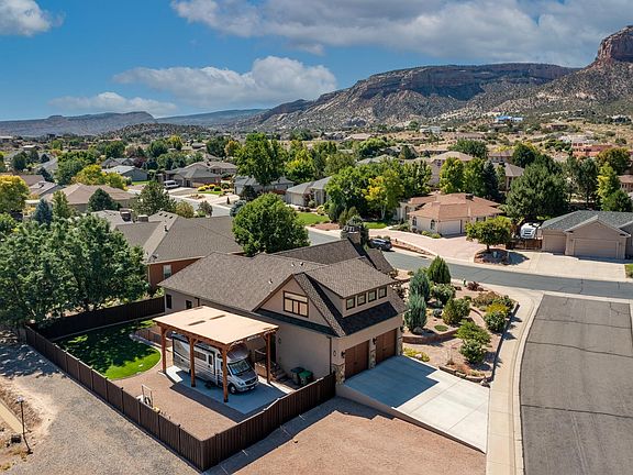 Mountain contemporary four bedroom home with oodles of unique custom features. Close views of Granite Falls and Liberty Cap on the CO National Monument in a neighborhood setting with plenty of sidewalk paths and walking distance to the Elementary School. Entertain in the great room that opens to a patio through a wall of bi-fold doors with retractable screen and an automatic awning for cover. Enjoy a gourmet kitchen with commercial grade appliances, custom cabinetry, unique sandalwood stone entertainment island and wet bar. View the Book Cliffs from the primary bedroom and don't miss the semi-precious stone featured in the bath. Humidifall water feature provides healthy humidity to the main living area. Savant System with integrated audio, video, security and environmental sensors throughout the home – all managed via a phone/tablet app. Custom iron work (interior/exterior) by local and Boston artists. RV carport with 50A service and dump. 30A service in attached garage for charging an electric vehicle. Additional finished spaces include a loft, a rec room gym, a wine closet and a multipurpose room. Professionally landscaped and fully irrigated as part of HOA. Another bedroom and bath are roughed-in for a future in-law/au pair suite.