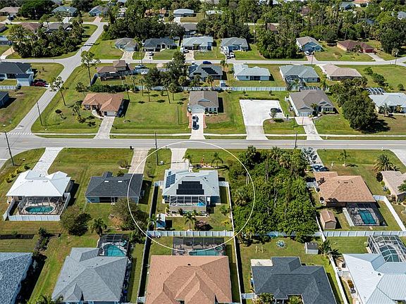 Beautiful 3-bedroom, 2-bathroom, 2-car garage pool home in North Port boasting incredible solar savings and showing better than brand new! Custom decorator touches are featured throughout this stunning residence. Step inside the welcoming entry and enjoy the fenced yard, elegant ceramic plank tile flooring, rounded corners, and sunburst windows that flood the home with natural light.The chef-worthy kitchen features white shaker cabinetry with soft-close doors and drawers, a subway tile backsplash, spacious pantry, granite countertops, a convenient breakfast island, and quality appliances. The spacious living room and separate dining area are adorned with custom accents—perfect for entertaining family and friends. The master suite is your personal retreat, offering private patio and pool access, a large walk-in closet, and a beautifully updated ensuite bath complete with dual sinks, granite-topped vanities, and a private commode. Both guest bedrooms comfortably accommodate visitors and share an updated bathroom that reflects the home’s modern style. Step outside to your oversized, private pool area featuring a generous sundeck, large covered patio, and a unique custom tiki-style outdoor wet bar—ideal for gatherings and creating lasting memories. Gardening enthusiasts will love the pergola misting system designed to nurture an orchid collection, bringing effortless beauty to your backyard oasis. Additional updates and features include: 2023 pool cage, 2025 A/C system, Recent survey, Public water and septic tank (2013), Smart 8-zone sprinkler system with adjustable Bluetooth technology (2020), Inside laundry room with extra storage cabinetry, Miami-Dade Kevlar hurricane protection for added value and peace of mind! Energy efficiency is a highlight with 29 solar panels (1/2 already paid off by seller for instant solar equity) resulting in an incredibly low average power bill of just $279.00 a month. Garage enthusiasts will appreciate the sliding screened doors allowing extra airflow, privacy, and refreshing cross breezes. Plus, there's an 8x10 outdoor shed with electricity and water—perfect for your tools and hobbies. No HOA or flood insurance is required.This spectacular POOL HOME with Privacy is located near to many amenities. North Port has Myakka State Park and Myakkahatchee Creek Environmental Center Park with miles of great trails, horseback riding, hiking, bird watching, biking, water views and access. Close to PG airport, dining, shopping, Stadium and beaches, Warm Mineral Springs and Aquatic Center. This SOLAR beauty truly combines luxury, comfort, and savings—your perfect private resort in North Port!. Act quickly and check this stunner out —this opportunity won’t last!