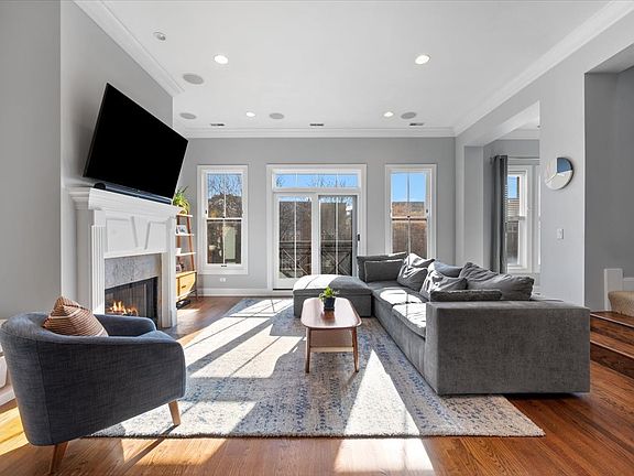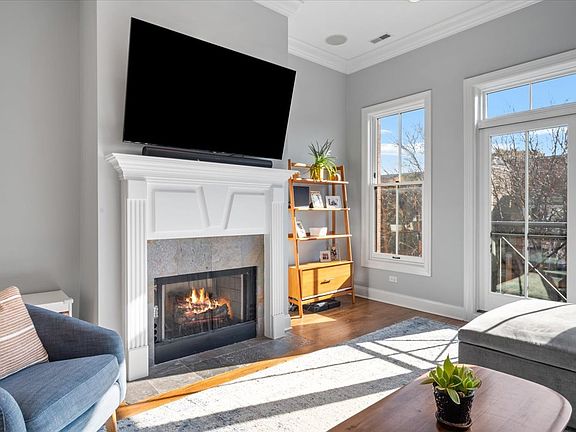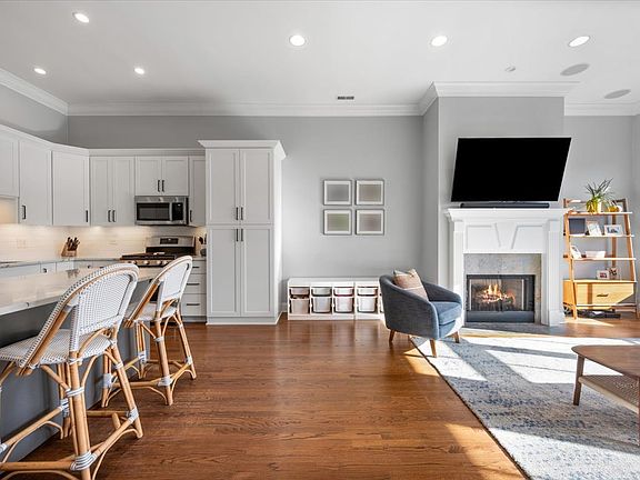 Modern comfort meets neighborhood charm in this spacious sun-filled 3 bed + den / 2.5 bath penthouse with private roof deck in the heart of Roscoe Village. Located in a boutique elevator building with garage parking included, this beautifully maintained home offers an ideal blend of space, light & convenience. Extra-wide layout features floor-to-ceiling south-facing windows, hardwood floors throughout, soaring 11' ceilings, gas fireplace, and an open-concept living & dining area that flows seamlessly into the beautifully updated kitchen (2021) with stainless steel appliances, quartz countertops, shaker cabinetry, and an oversized breakfast bar--perfect for entertaining. The large primary suite features a walk-in closet and ensuite spa-like bathroom with double vanity, water closet & large standalone shower. Two additional bedrooms, a full second bathroom, powder room, in-unit laundry, and ample closet space complete the interior. Enjoy incredible skyline views from your private rooftop deck with custom dry bar (2021)--ideal for outdoor living at its best. One of only a few units in the building with an additional den, offering flexible space for a home office, playroom or lounge area. All of this in a premier Roscoe Village location, steps from boutiques, cafes, restaurants & parks--with easy access to transit and Level 1+ Audubon School District. This is not to be missed!