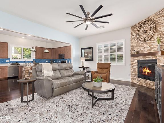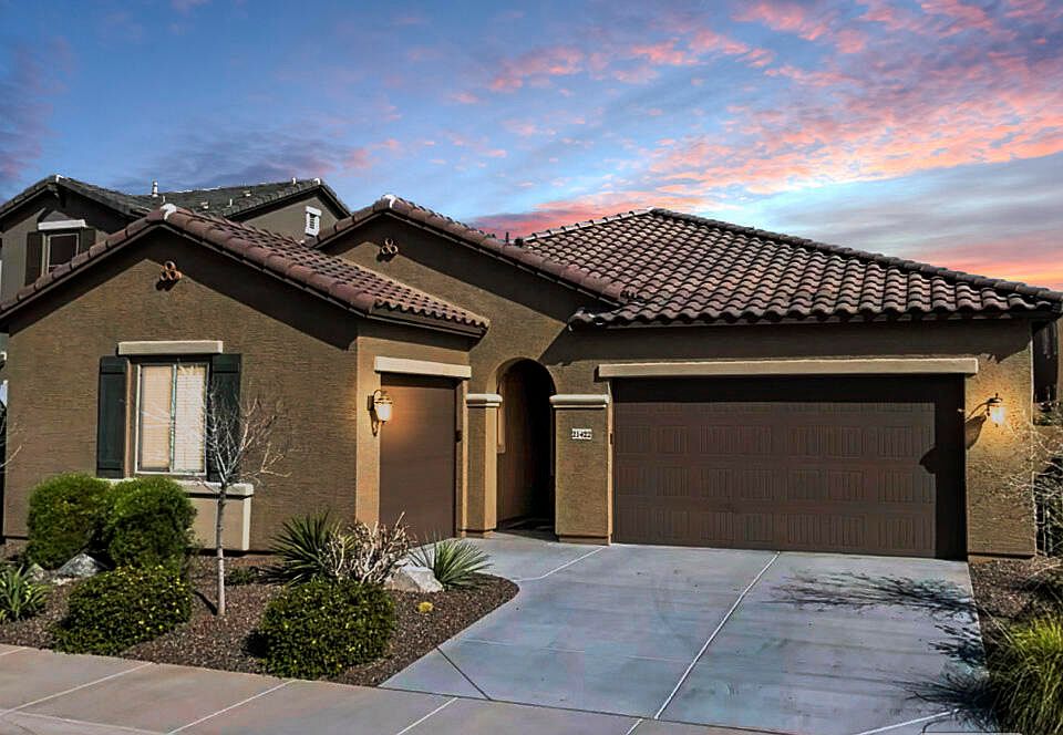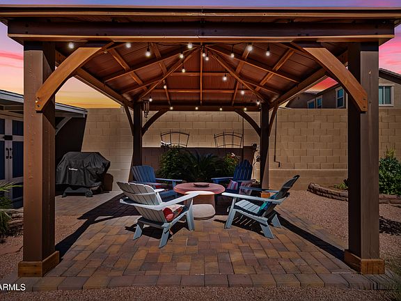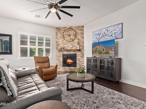 Welcome Home to this beautifully upgraded 2,246 sq ft single level! Nicely upgraded kitchen with upgraded maple cabinetry ($20k), quartz counter-tops, upgraded appliances and island open to large Great Room with wood flooring & cozy fireplace. 3 bedrooms PLUS a Den/Study with built-in desks. 2.5 baths. Luxury Owner's bath with dual vanities, soaking tub, separate shower and spacious walk-in closet. Backyard features covered patio, extended brick pavers, lighted pergola and shed for lots of extra storage. 3 car split garage, both with epoxy floors. The double garage is extended length plus oversize garage door. Water softener & R/O system included. *** Sienna Hills features community pool, fitness center, parks / playgrounds and walking trails. Nice location next to charming Verrado.