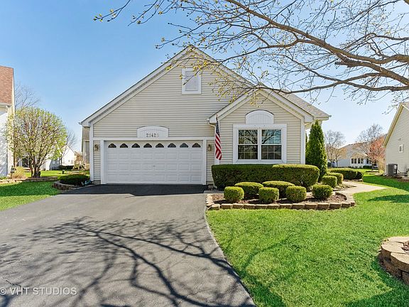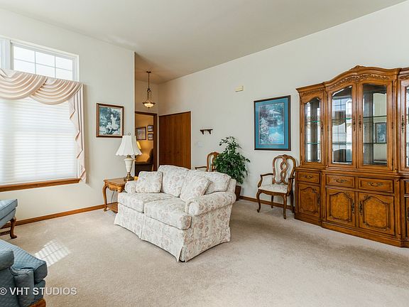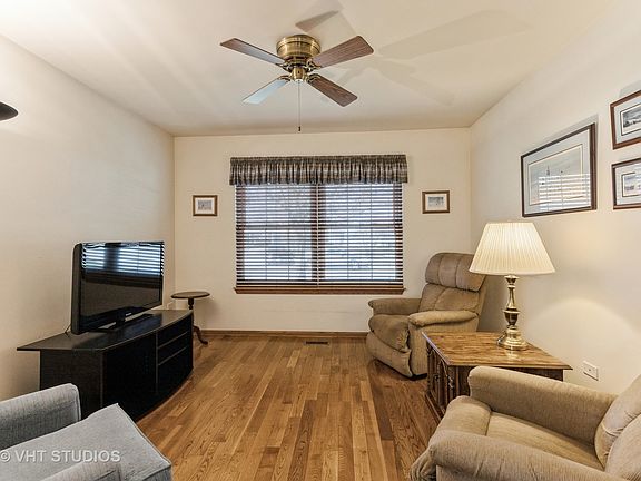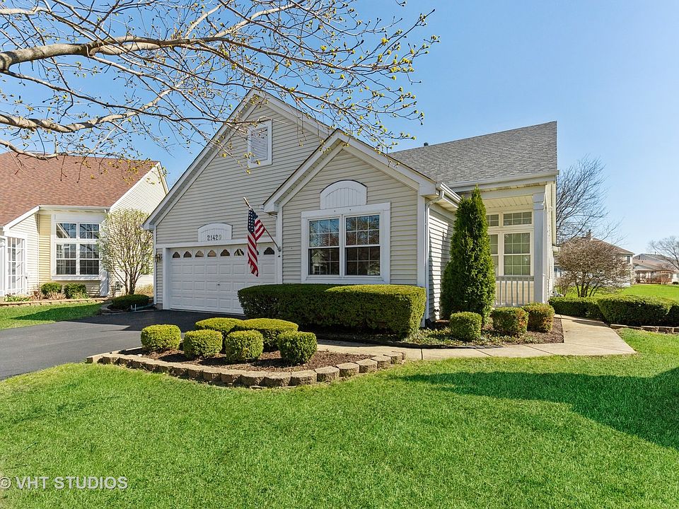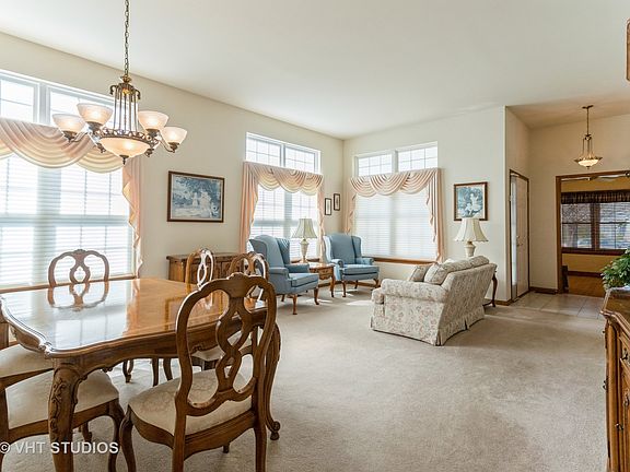 CONTEMPORAY OPEN RANCH FLOOR PLAN ON CUL-DE-SAC LOT, FRONT PORCH, AND 2 CAR ATTACHED GARAGE. CARPETED COMBINATION LIVING AND DINING ROOM, DEN W/HARDWOOD FLOORS, LARGE CARPETED PRIMARY SUITE WITH WALK-IN CLOSET AND PRIVATE BATH. CARPETED SECONDARY BEDROOM WITH TRACK LIGHTING. FULLY WHITE APPLIANCED KITCHEN WITH OAK CABINETRY, CORIAN COUNTER TOPS, RECESSED LIGHTING INCLUDING WASHER AND DRYER. SPACIOUS BREAKFAST AREA WITH WOOD LAMINATED FLOORS AND FRENCH DOORS TO ALL SEASONS ROOM THAT HAS SGD TO DECK. FULL BASEMENT THAT IS APPROXIMATELY ONE THIRD FINISHED WITH COUNTER TOP AND SINK. NEUTRAL DECOR THROUGHOUT. 55+ADULT COMMUNITY. LOCATED CLOSE TO GOLF COURSE, I-55, AND SHOPPING. OTHER INCLUSIONS ARE CEILING FANS AND SOLAR TUBE LIGHTING