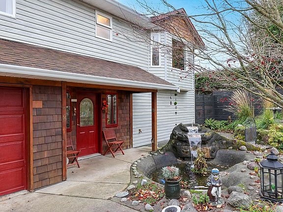 Expansive views of the Beaufort Mtn Range, and south to the Comox Harbour. A fantastic floor plan w/ main living on the upper level to capture the views, and a private in-law suite on the lower level. The Great room boasts a split heat pump for efficient heating & A/C, cozy gas fireplace, gleaming hardwood flooring, large picture windows, a slider w/ built-in blinds, a full width deck & 2 yr old electric awning. The kitchen renovation created a well-designed space w/ a full pantry, s/s appliances, gas range, live edge bar w/ seating, quartz counters, & fantastic views! The hardwood flooring extends into the 2 bedrooms on the upper-level, one with a Murphy bed, and the primary offers a walk-in closet & 4 pce ensuite. The lower level is ideal for a family in-law suite w/ a spacious family room, bedroom, 4 pce bath and kitchenette. Easy access to the covered patio, fenced yard, raised beds, shed, figs, plums & hazelnuts! Fabulous water feature & low maintenance river rock landscaping.