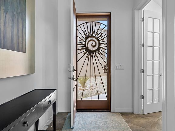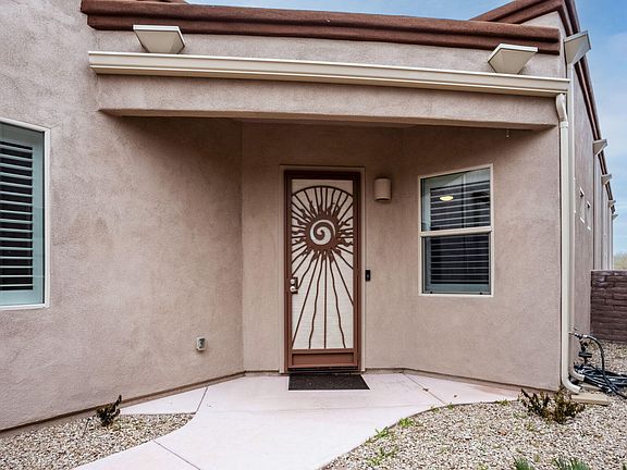 Offering spectacular views of the Santa Ritas, you'll fall for this spacious Sentinel Hill home and its upgraded features indoors and out. Enjoy the convenience of an attached RV garage with 12' door, mini split, and two 30-amp receptacles.Walled courtyard features covered and open terraces, providing an ideal setting for al fresco living, dining, grilling and gathering. Interior features in this light, bright open-concept home include vaulted ceilings, skylights, porcelain tile flooring, kiva fireplace, and upgraded fixtures and finishes throughout. Generous open kitchen features custom cabinetry, granite counters, Carrara marble backsplash, stainless steel appliances and seated bar for casual dining. Relax and restore in the primary suite featuring en suite bath with custom tile work.