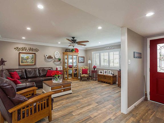 Knock your socks off adorable. Upgrades and Unique style will leave you remembering this home for a long time. The kitchen features custom cabinetry and great storage, Thermador dishwasher & range, solid 3/4 inch granite counter-tops and touch free faucet. The flooring throughout this home is warm and natural wood-like porcelain tile. Newer windows, crown molding, recessed lighting and Plantation shutters. The bathrooms are remodeled, the bedrooms all have ceiling fans. There is extra long RV parking along the side of the house. The garage is attached with room for 2 cars and a built in laundry room with sink and cabinets. Tankless water heater and more. The backyard has real grass, a lemon tree, covered patio, a custom shed and plenty of room to play and entertain. True pride of home-ownership shows from the minute you walk in the door and throughout every inch of this home.