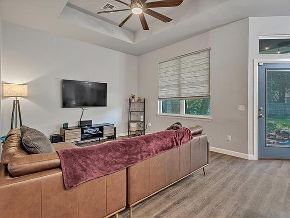 Step into the bright and airy living room featuring a tray ceiling, oversized barn-style ceiling fan, and breathtaking windows that bathe the space in natural light. Sleek vinyl flooring flows throughout the main areas, giving a clean and contemporary feel.
