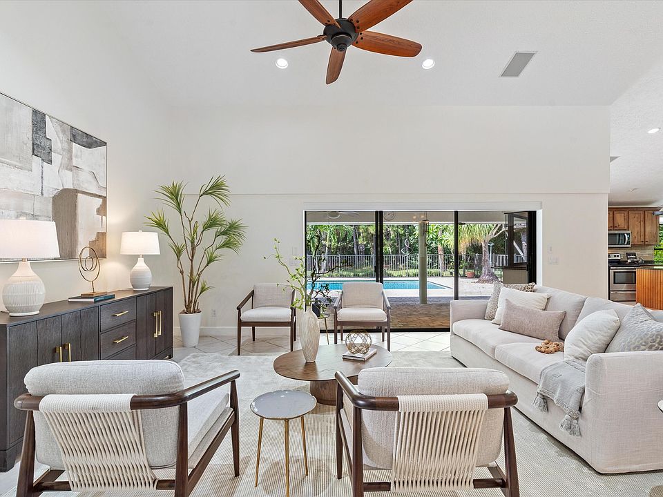 Don't miss this beautiful airy & open home with vaulted ceilings, ideal split floorplan, beautiful custom pool and lush, serene preserve views from every room. The custom kitchen is ideal w/ large windows overlooking the pool & outdoor living space, perfect for entertaining & dining alfresco. This lot is gorgeous w/ beautiful oaks & pines, a firepit & room to play. Beautifully maintained, freshly painted, detailed & ready for quick closing. Enjoy a high-end Crestron lighting/security system, 2016 A/C, upgraded bathrooms & all tile except in 2 bedrooms. This charming community is zoned excellent school zones, is minutes to stunning beaches, all amenities as well as 95/turnpike for easy access for travel. More> Upon entering, you'll love the open floorplan and view straight out to the pool, serene preserve and feeling of privacy. To your left, the master suite offers vaulted ceilings, an en-suite updated master bath w/ beautiful cabinetry, granite, dual sinks, walk in shower w/ seamless glass door, soaking tub and walk in closet. French doors open to the covered back patio and pool area. Seller open to credit for new flooring! We have removed the older flooring so the new buyer can customize the flooring in this room. There is an office/4th bedroom w/small closet off the main living area near the master with a sunny window! On the opposite side of the home, you have 2 bedrooms, a full bath, walk in laundry room and freshly painted 2 car garage with a secondary refrigerator. The 3rd full bathroom is outside off of the covered back patio, and acts as the cabana bathroom for the pool. This has a new vanity, toilet and large walk-in shower.