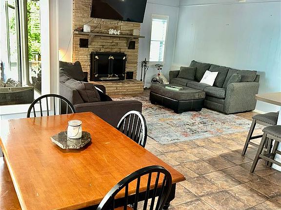 Just in time for summer! Rarely available, this charming lakefront home is nestled in the sought-after Hendryx Point. Enjoy breathtaking views and direct lake frontage, complimented by a wrap-around porch and a large day dock—perfect for sunbathing, fishing, or docking small to medium boats. The property features a detached one-car carport with additional concrete parking space. Inside, the updated kitchen boasts a spacious island, while the living room impresses with high ceilings, a rustic wood beam, and a cozy wood-burning fireplace equipped with return heat vents. The laundry area is in the primary bedroom.