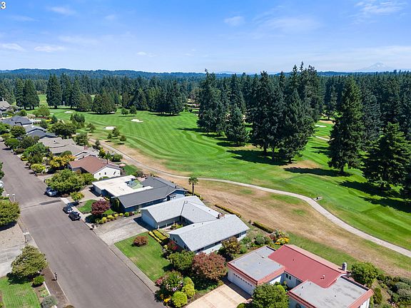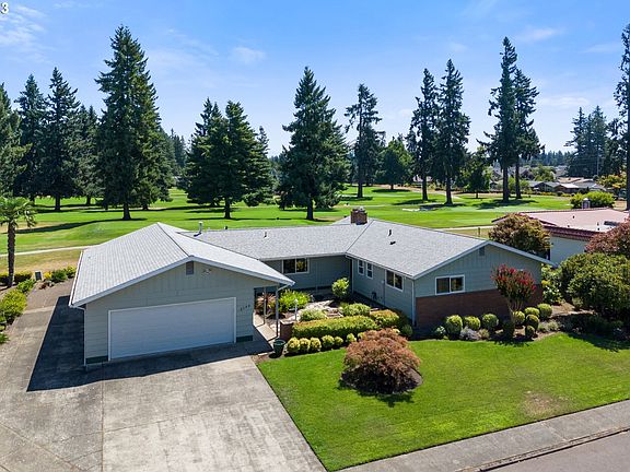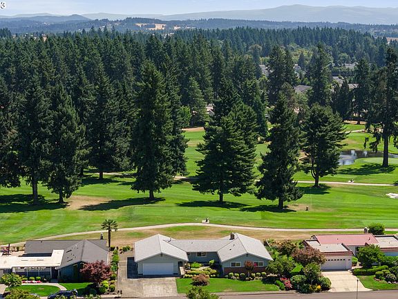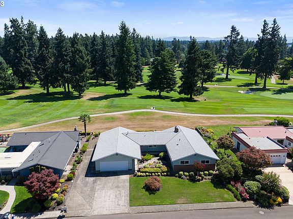 Enjoy life on the 18th hole! Rare opportunity to own a delightful home right on the green. The well cared for home has a great layout with a classic, mid-century modern double sided fire place in the living spaces, and nice open kitchen. The detached garage has a full shop area with lots of space for your activities. There are 3 bedrooms, including a primary with an attached bathroom. There is an additional bonus room as well! Enjoy lovely evenings on the lanai facing out onto the golf course, watching golfers finish their rounds and enjoying the beautiful tree lined course.
