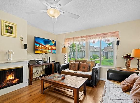 Highly Upgraded corner Unit w Laminate Flooring. Double Pane Windows; Newer Paint, newer kitchen with new cabinet, Updated Appliances. Central Air plus ceiling fans in almost every bedroom. two car garage. Conveniently located about two miles from Disneyland and about 10 miles to the beach.