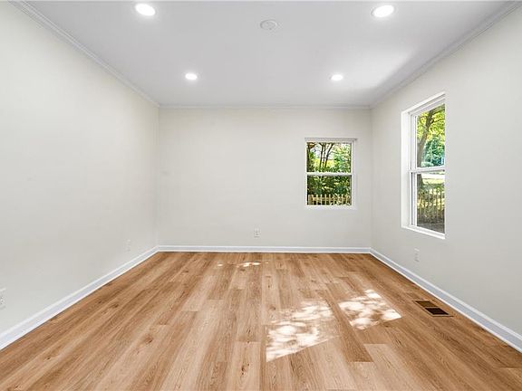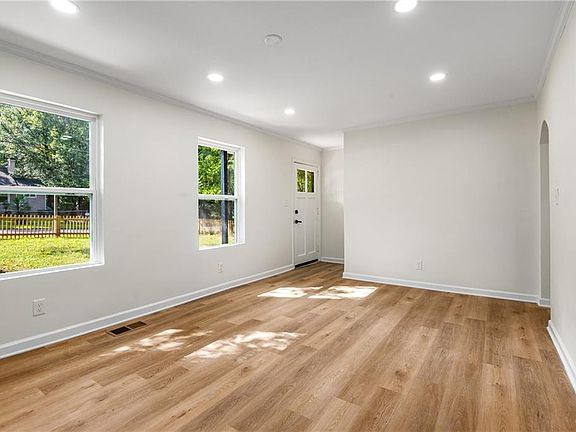 This beautifully renovated 3 bedroom, 2 bathroom home offers a perfect blend of style, comfort, and convenience. Step inside to find a thoughtfully redesigned interior featuring brand-new flooring, fresh paint inside and out, recessed lighting, new windows, a new roof, and more. The spacious living room flows seamlessly through charming arched entryways into the renovated kitchen, complete with sleek white countertops, crisp white cabinetry, and new fixtures. French doors off the kitchen open to a large deck overlooking an expansive backyard ideal for entertaining, pets, or simply enjoying the outdoors. The home’s layout boasts a private primary suite upstairs, creating a true retreat with its fully updated ensuite bathroom. Both bathrooms shine with new flooring, custom tilework, modern vanities, and stylish fixtures. Outside, the curb appeal shines with a charming front yard fence, ample driveway parking, and a brand-new portico entryway that adds character and warmth. Located just minutes from Tyler Perry Studios, Downtown East Point, and Hartsfield-Jackson Airport, this home offers not only modern comfort but also unbeatable access to the best of Atlanta living. Several photos in this listing are virtually staged.