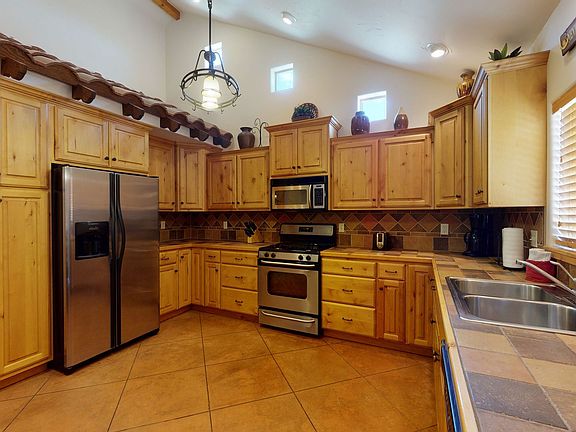 The kitchen has a plentitude of pine cabinets and tile countertops and is equipped w/cookware, dishes, utensils, coffeemaker, and toaster. High-end appliances include a gas range w/a center cook grill, side-by-side refrigerator with water/ice dispenser, dishwasher, and built-in microwave. The back patio is equipped w/gas barbeque grill, a picnic table and chairs.