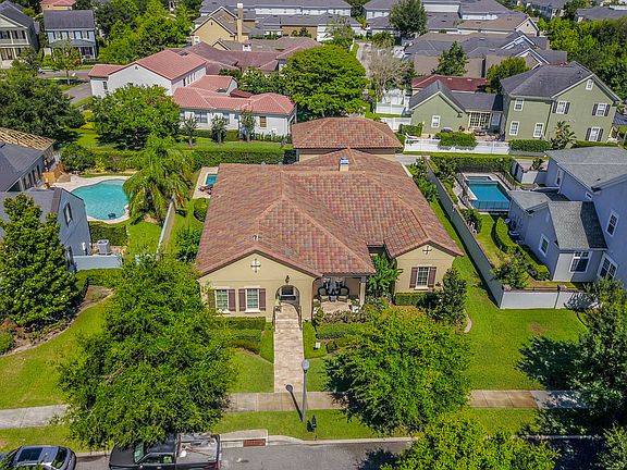 Breathtaking 4134 sq ft custom Mediterranean home located in the heart of Baldwin Park walking distance to New Broad Park and the village center. This exquisite 5 bedroom and 5.1 baths has a wonderful open concept floor plan and showcases beautiful hardwood floors and stunning upgrades through-out. Features include spacious kitchen, stainless appliances, granite countertops, family and formal dining room, study with built in book cases. Relax and enjoy the warm weather in your salt water pool and hot tub with outdoor seating, speakers and TV on the lanai -- great for entertaining with family and friends! This home also features a beautiful master bedroom with an en suite bath, his and her sinks, jetted tub, separate shower and custom master walk-in-closet. This home also boast a mother-in-law suite with kitchen, dinette, family room, bedroom and bath with laundry room perfect for family visits or potential rental income. Additional features include recently installed tongue and groove ceiling on front porch and lanai, hardware video surveillance system, klipseh 5.1 surround system and side yard green space. Baldwin Park is a wonderful place to live offering great schools, premier shops and restaurants. Convenient to Downtown Orlando, theme parks and beautiful Winter Park! Don't miss this wonderful opportunity call today to schedule your private viewing of this home!