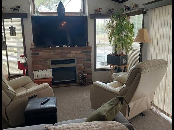York Regional Forest At Your Door! Step Into A Bright, Cozy 2 bed, 1 bath Home, Where Comfort Meets Convenience. The Warm Living Room With Electric Fireplace Is Perfect For Movie Nights, While The Eat In Kitchen Adds Flexible Space For Lounging Or Hosting. The Backyard Is Built To Host At Lot 154 With A Multizone Deck With A Custom Outdoor Bar For Stool Seating, Umbrella Lounge And Bbq Nook, All Framed By Mature Trees and Gardens. Love The Outdoors? Walk Straight To Forest Trails... Ideal For Nature Enthusiasts. Extras Include Two Handy Sheds To Store Gear And Toys, And There's Parking For 3. Move In Ready, Affordable, And Set In A Warm Community, This One's An Easy "Yes". Book Your Showing Today!