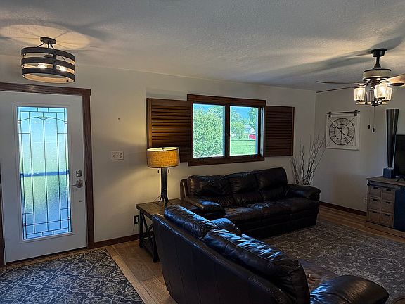 This 1716 sq. ft. home is located on 1.8 acres of open land and includes 3 bedrooms and 1.75 bathrooms. The basement adds another finished 738 sq. ft. and an additional bedroom. The interior has an open floor plan with spacious living areas and a wood-burning fireplace. A sunroom, suitable for use as a home office, is included, and the kitchen was renovated in 2021 with new appliances.